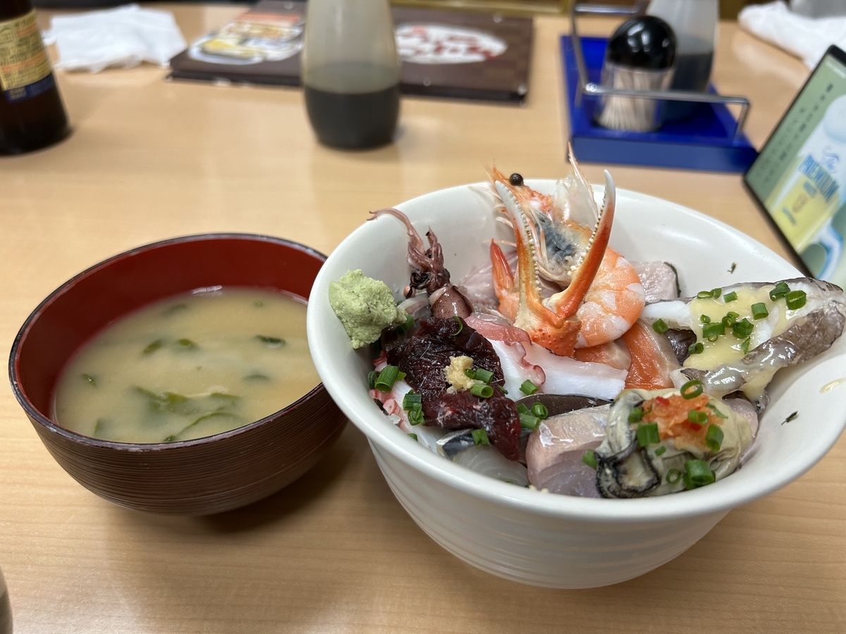 夜にご飯を食べられるようなお店として見つけたつもりが、完全にお酒を飲むお店。相席でちょうどお酒を飲んでる二組に挟まれる形で一人海鮮丼を食べるよ。